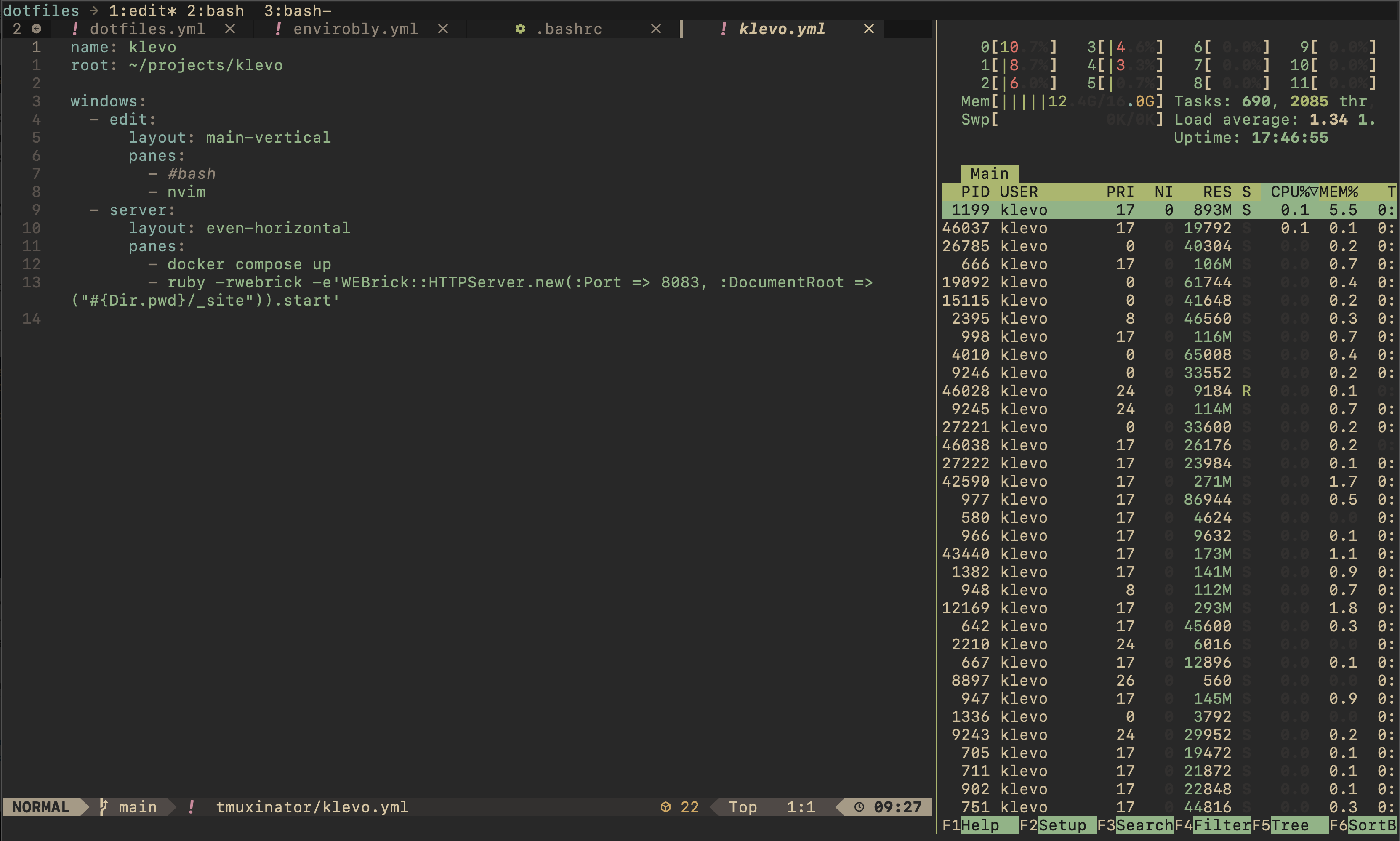 In Zellij, layouts are build in and a wonderful feature. In tmux land, there is tmuxinator–a separate program–that handles layout definition via YAML files and starting sessions based on those layouts. It’s simple and I got going with it immediately.